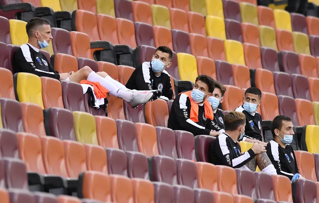 Rezervele Mediasului, cu masti de protectie pe fata, cu Thomas Juel Nielsen primul din stanga la meciul de fotbal dintre FCSB si Gaz Metan Medias, contand pentru play-off-ul Ligii 1 Casa Pariurilor, disputat fara spectatori pe Arena Nationala din Bucuresti, duminica 21 iunie 2020. © FOTO:Razvan Pasarica/SPORT PICTURES