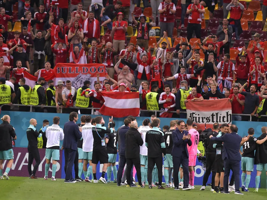 Fotbalistii austrieci saluta galeria dupa meciul de fotbal dintre Austria si Macedonia de Nord, din cadrul EURO 2020, desfasurat pe Arena Nationala din Bucuresti, duminica 13 iunie 2021. © FOTO:Razvan Pasarica/SPORT PICTURES