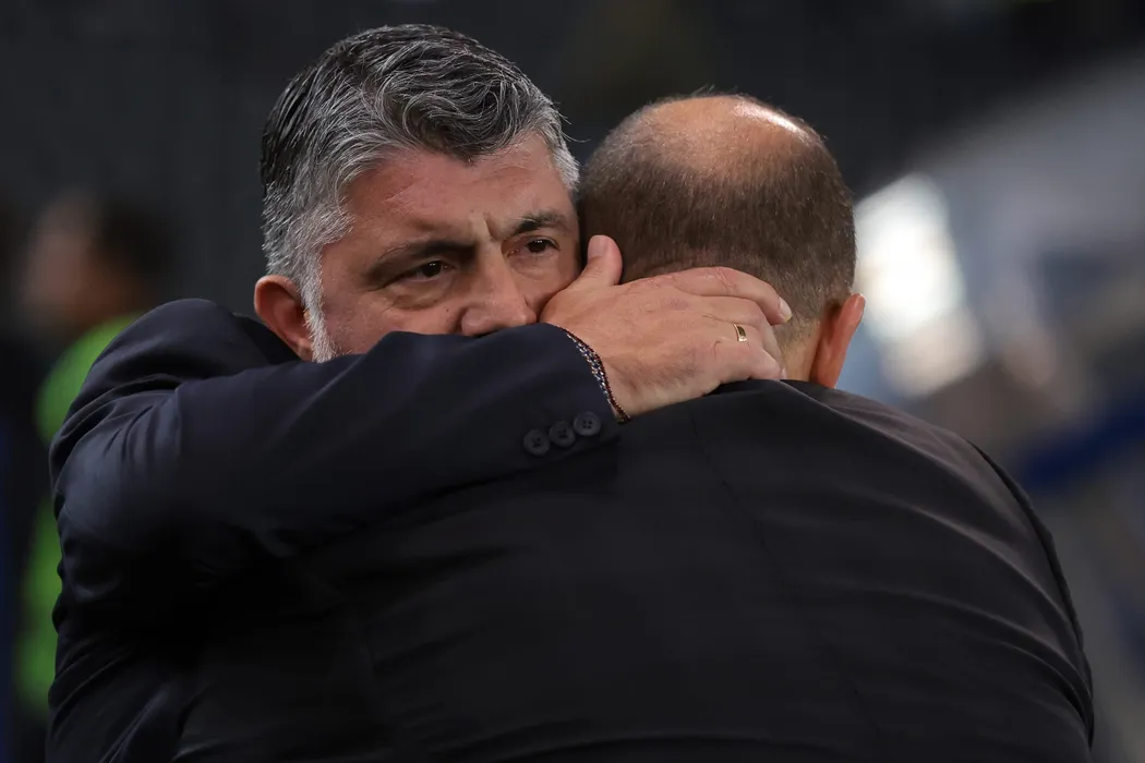14 October 2025, Italy, Udine: Italy head coach Gennaro Gattuso embraces Israel head coach Ran Ben Simon ahead of the FIFA World Cup European Qualifying soccer match between Italy and Israel at Bluenergy Stadium. Photo: Jonathan Moscrop/CSM via ZUMA Press Wire/dpa