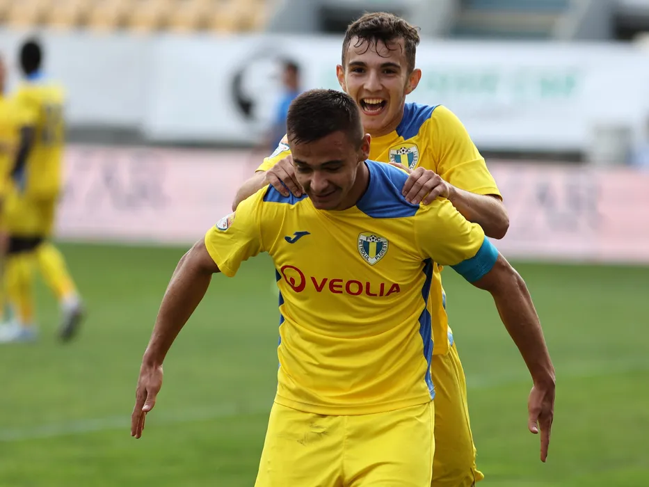 Mario-George Bratu se bucura dupa un gol marcat alaturi de Valentin Ticu in meciul de fotbal dintre Petrolul Ploiesti si Dunarea Calarasi, contand pentru Liga a-2-a Casa Pariurilor, desfasurat pe Stadionul Ilie Oana din Ploiesti, sambata 6 noiembrie 2021. © FOTO:Razvan Pasarica/SPORT PICTURES