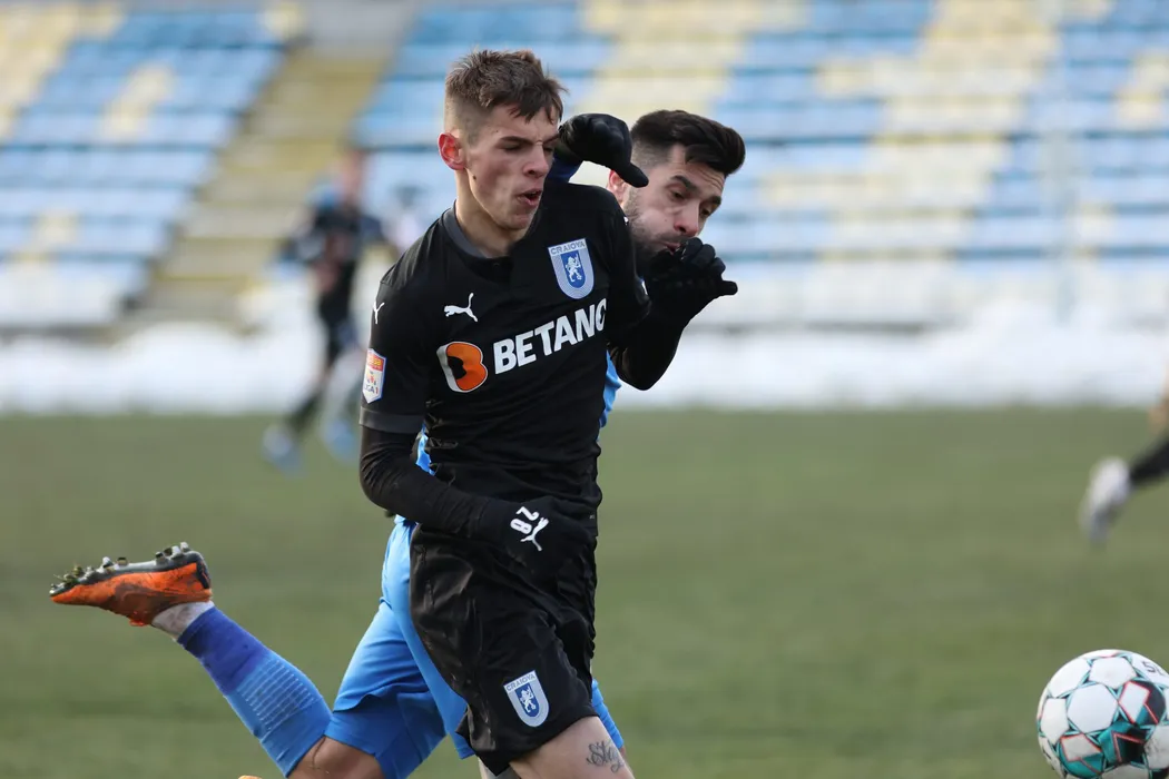 Alexandru George Cimpanu si Paul Ovidiu Pirvulescu in meciul de fotbal dintre Academica Clinceni si Universitatea Craiova, contand pentru Liga 1 Casa Pariurilor, desfasurat pe Stadionul Municipal Ion Comsa din Calarasi, duminica 14 februarie 2021. © FOTO:Gheorghe Fluster/SPORT PICTURES