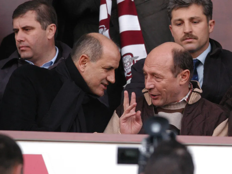 George Copos si Traian Basescu in tribuna la meciul de fotbal dintre Rapid Bucuresti si Hamburg SV, contand pentru Cupa UEFA, desfasurat pe Stadionul Giulesti-Valentin Stanescu din Bucuresti, joi 9 martie 2006. © FOTO:Razvan Pasarica/SPORT PICTURES