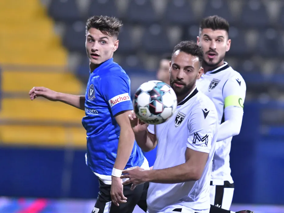 George Danut Ganea si Mourad Satli in meciul de fotbal dintre FC Viitorul Constanta si FC Voluntari, din cadrul Ligii 1 Casa Pariurilor, desfasurat fara spectatori pe Stadionul Central al Academiei Gheorghe Hagi din Ovidiu, luni 8 februarie 2021. © FOTO:Razvan Pasarica/SPORT PICTURES
