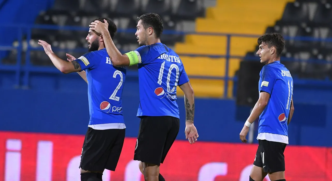 Bucurie a fotbalistilor de la Viitorul cu Radu Stefanita Boboc, Gabriel Cristian Iancu si George Danut Ganea in meciul de fotbal dintre FC Viitorul si AFC Hermannstadt, contand pentru play-out-ul Ligii 1 Casa Pariurilor, disputat fara spectatori pe Arena centrala a Academiei Gheorghe Hagi din Ovidiu, luni 22 iunie 2020. © FOTO:Razvan Pasarica/SPORT PICTURES