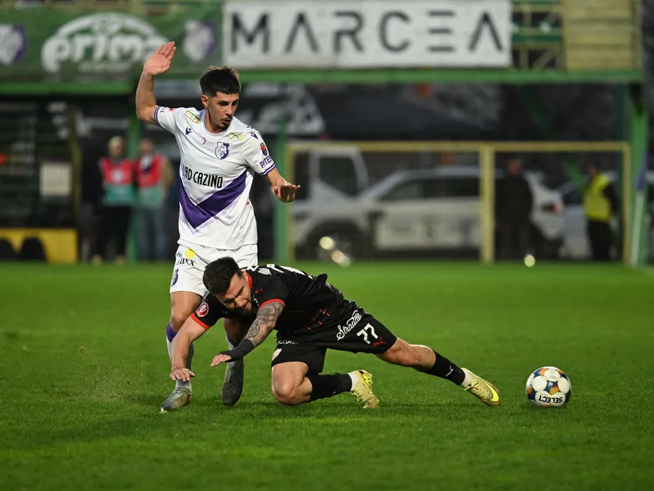 Florin Gheorghe Borta si Danniel Charles Armstrong in meciul de fotbal dintre FC Arges si Dinamo Bucuresti, contand pentru Play off-ul Superligii Superbet, desfasurat pe Stadionul Orasenesc din Mioveni, sambata 4 aprilie 2026. © FOTO:Razvan Pasarica/SPORT PICTURES