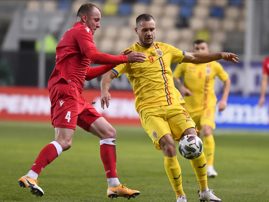 Nikita Naumov si George Puscas in meciul de fotbal dintre Romania si Belarus, contand pentru Liga Natiunilor, desfasurat fara spectatori pe Stadionul Ilie Oana din Ploiesti, miercuri 11 noiembrie 2020. © FOTO:Razvan Pasarica/SPORT PICTURES