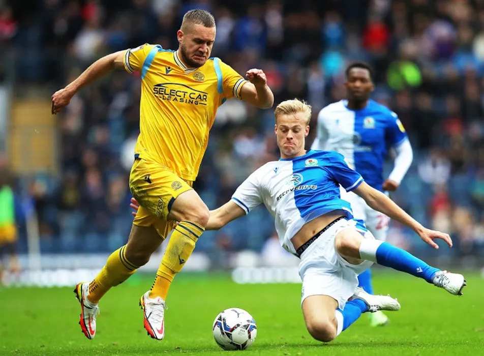 Reading's George Puscas (left) and Blackburn Rovers' Jan Paul van Hecke battle for the ball during the Sky Bet Championship match at Ewood Park, Blackburn. Picture date: Saturday October 23, 2021. (Photo by Tim Markland/PA Images via Getty Images)