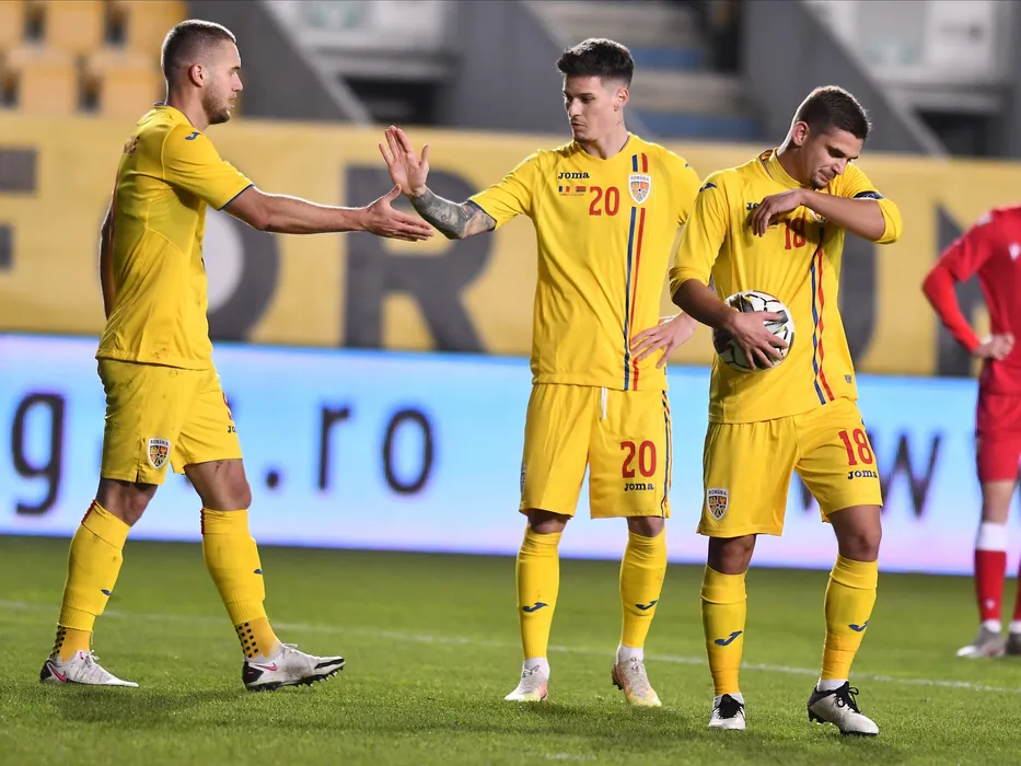 Dennis Man il felicita pe George Puscas dupa ce a scos un penalty batut de catre Razvan Marin in meciul de fotbal dintre Romania si Belarus, contand pentru Liga Natiunilor, desfasurat fara spectatori pe Stadionul Ilie Oana din Ploiesti, miercuri 11 noiembrie 2020. © FOTO:Razvan Pasarica/SPORT PICTURES
