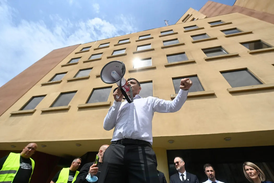 Deputatul George Simion se adreseaza membrilor sindicatelor din transportul public ce protesteaza fata de concedierea mai multor angajati ai STB, dupa protestul din ianuarie 2022, in fata sediului Societatii de Transport Bucuresti(STB), joi, 5 mai 2022. EDUARD VINATORU / MEDIAFAX FOTO