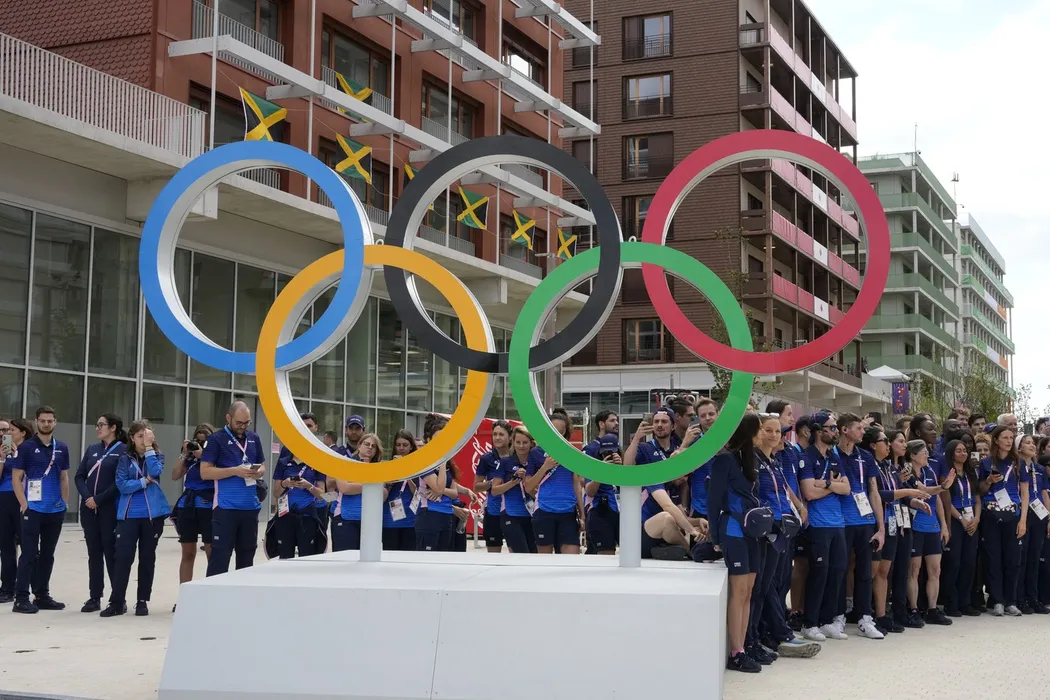 French athletes gather near Olympic rings as he visits the Olympic Village, at the 2024 Summer Olympics, Monday, July 22, 2024, in Paris, France. (AP Photo/Michel Euler, Pool),Image: 891406016, License: Rights-managed, Restrictions: , Model Release: no