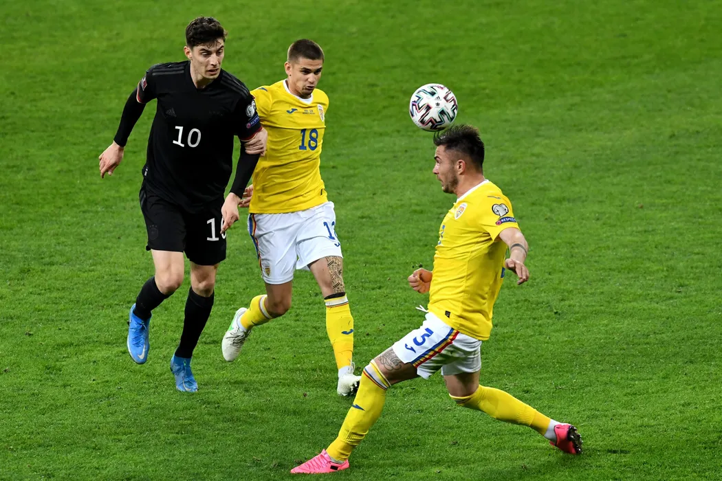 Alin Tosca (D), de la nationala de fotbal a Romaniei, lupta pentru posesia balonului in timpul meciului Romania - Germania din etapa a doua a preliminariilor Campionatului Mondial, disputat pe Arena Nationala din Bucuresti, duminica, 28 martie 2021. FLAVIU BUBOI / MEDIAFAX FOTO