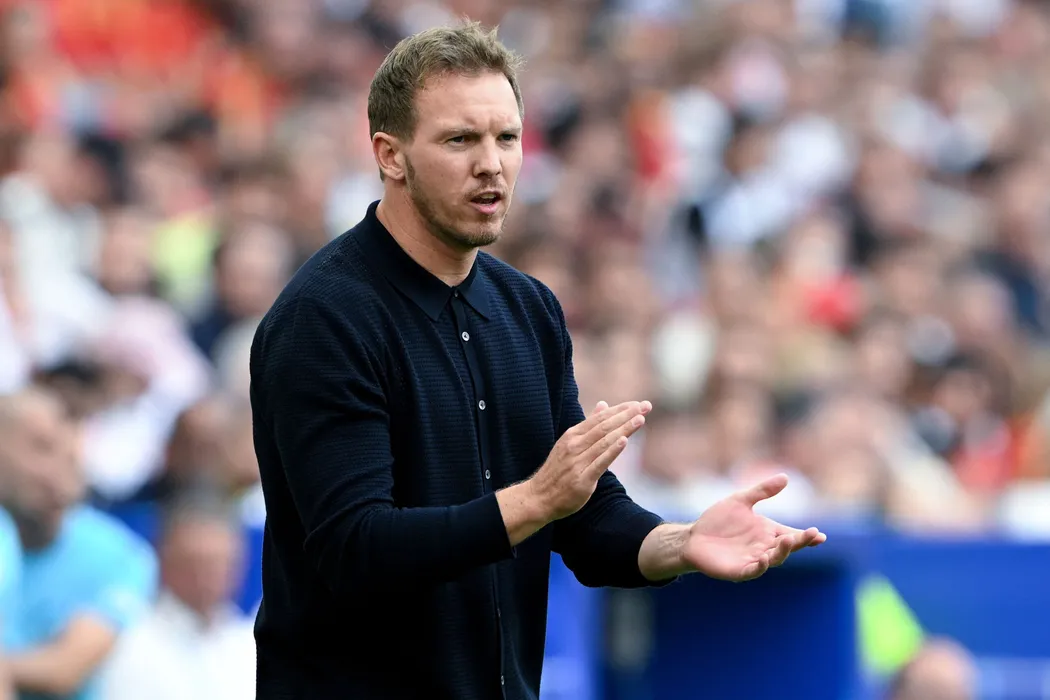 05 July 2024, Baden-Württemberg, Stuttgart: Germany national coach Julian Nagelsmann cheers on his team during the UEFA EURO 2024 quarter-final soccer match between Spain and Germany at the MHPArena. Photo: Federico Gambarini/dpa/HEPTA/SPORT PICTURES