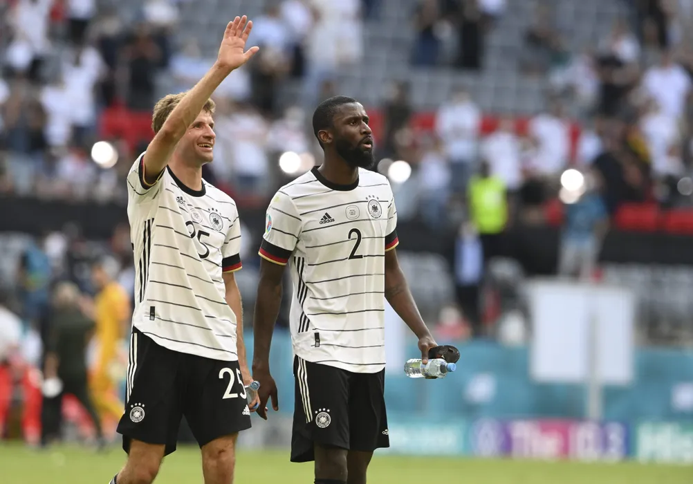 Germany's Thomas Mueller and Germany's Antonio Ruediger, right, celebrate after the Euro 2020 soccer championship group F match between Portugal and Germany at the football arena stadium in Munich, Saturday, June 19, 2021. Germany won the match 4-2. (Christof Stache/Pool via AP)