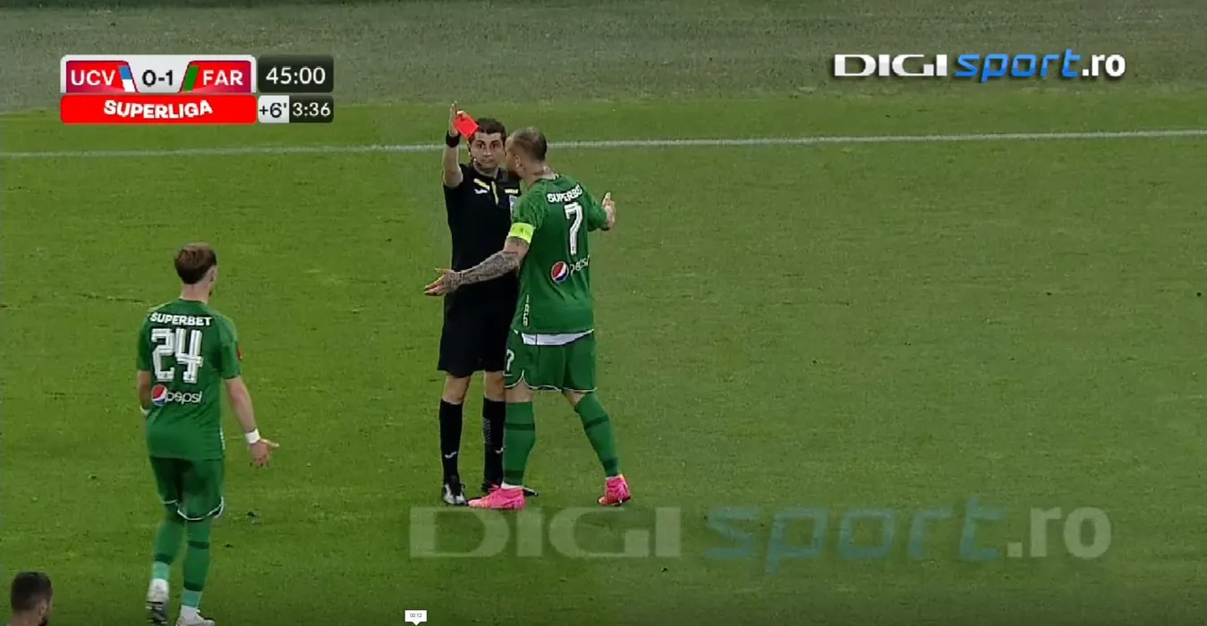 Gest halucinant al lui Denis Alibec în Universitatea Craiova – Farul: arbitrul Chivulete i-a dat roșu imediat pentru lovitura cu cotul dată în ceafa lui Ștefan Vlădoiu! Atacantul și-a pierdut cumpătul și a fost la un pas să sară la central! | VIDEO
