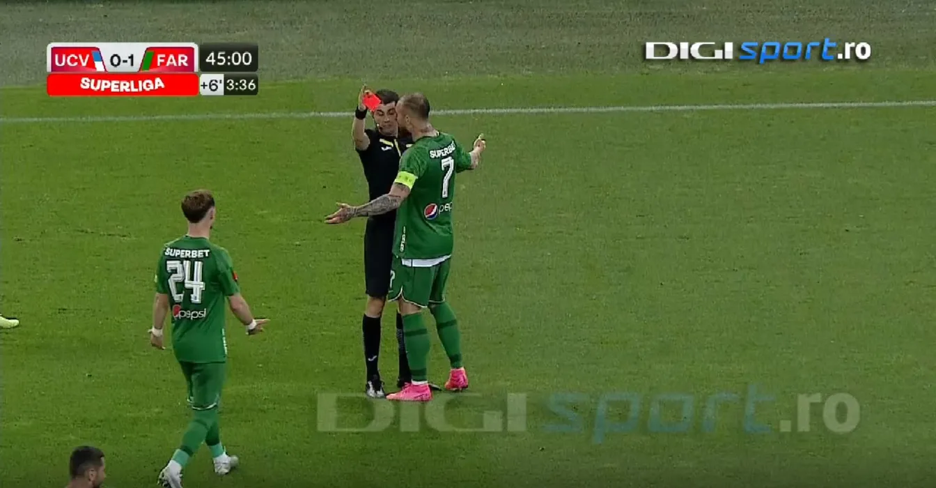 Gest halucinant al lui Denis Alibec în Universitatea Craiova – Farul: arbitrul Chivulete i-a dat roșu imediat pentru lovitura cu cotul dată în ceafa lui Ștefan Vlădoiu! Atacantul și-a pierdut cumpătul și a fost la un pas să sară la central! | VIDEO