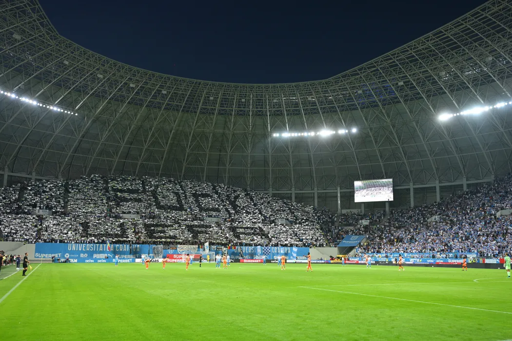 Coregrafie craioveana prezentata in peluza la meciul de fotbal dintre Universitatea Craiova si İstanbul Başakşehir FK, contand pentru Play-Off Conference League , desfasurat pe Stadionul Ion Oblemenco din Craiova, joi 28 august 2025. © FOTO:Raed Krishan/SPORT PICTURES