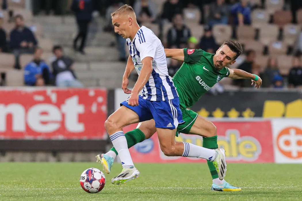 Topi Keskinen si Andrei Viorel Artean in meciul de fotbal dintre HJK Helsinki si Farul Constanta, contand pentru UEFA Europa Conference League, desfasurat pe Helsinki Football Stadium din Helsinki, joi 31 august 2023. © FOTO:Antonio Vasile/SPORT PICTURES