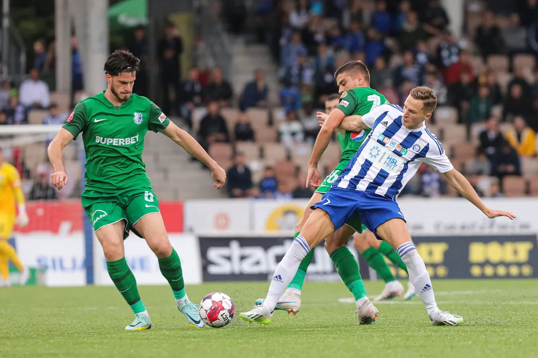 Tudor Cristian Baluta, Dragos Ionut Nedelcu si Santeri Hostikka in meciul de fotbal dintre HJK Helsinki si Farul Constanta, contand pentru UEFA Europa Conference League, desfasurat pe Helsinki Football Stadium din Helsinki, joi 31 august 2023. © FOTO:Antonio Vasile/SPORT PICTURES