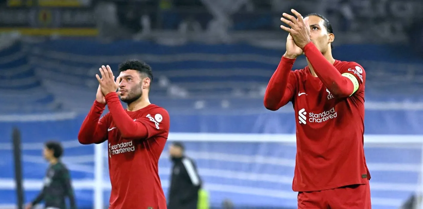 Liverpool's English midfielder Alex Oxlade-Chamberlain (L) and Liverpool's Dutch defender Virgil van Dijk applaud to fans at the end of the UEFA Champions League last 16 second leg football match between Real Madrid CF and Liverpool FC at the Santiago Bernabeu stadium in Madrid on March 15, 2023.,Image: 763053282, License: Rights-managed, Restrictions: , Model Release: no