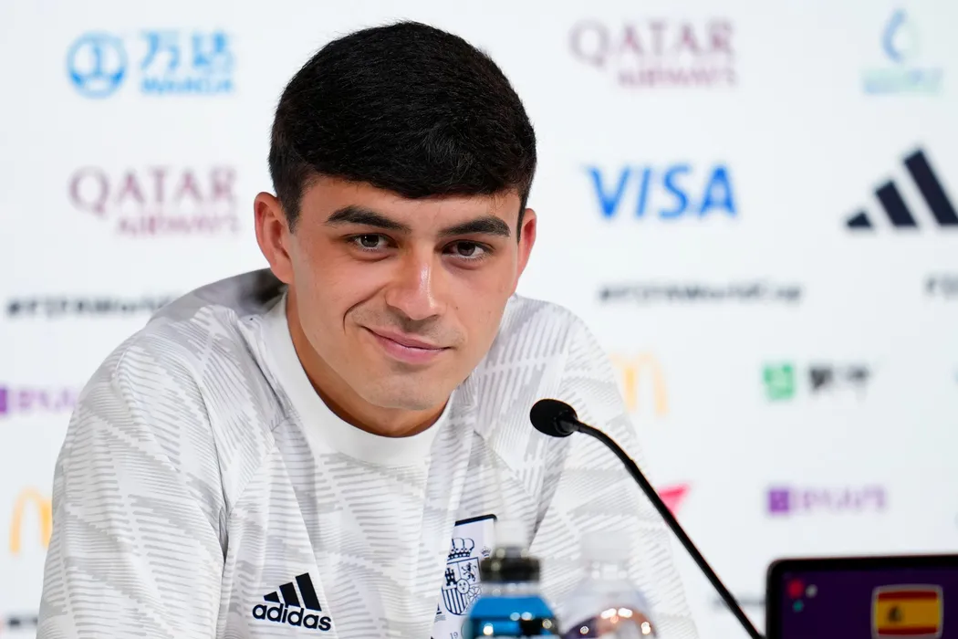Spain's Pedri speaks to reporters during a news conference, in Doha, Qatar, Monday, Dec. 5, 2022. Spain will play against Morocco in the round of 16 phase of the World Cup soccer tournament on Dec. 6.,Image: 742402879, License: Rights-managed, Restrictions: This content is intended for editorial use only. For other uses, additional clearances may be required., Model Release: no, Pictured: Pedri
