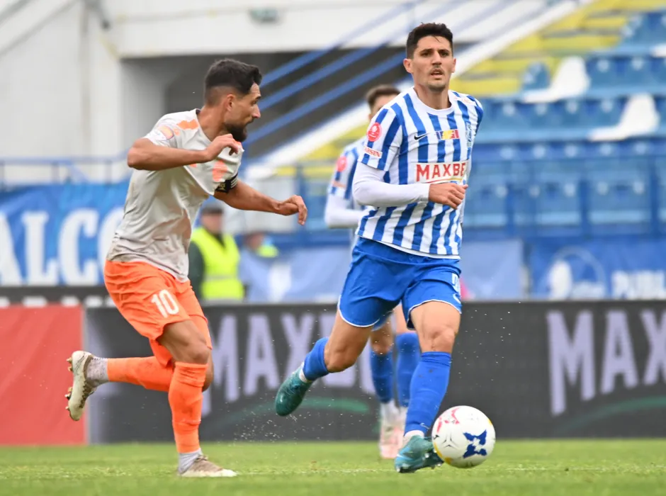 Georgian Honciu si Julian Augusto Marchioni Garobbio in meciul de fotbal dintre Poli Iasi si FC Metaloglobus Bucuresti, contand pentru Baraj SuperLiga Superbet, desfasurat pe Stadionul Emil Alexandrescu din Iasi, duminica 25 mai 2025. © FOTO: Dragos Pascaneanu/SPORT PICTURES