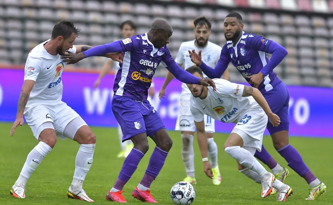 Sebastian Mladen, Kehinde Feyi Fatai si Aurelio Miguel Arias Jafar in meciul de fotbal dintre FC Arges si Farul Constanta, contand pentru Liga 1 Casa Pariurilor, desfasurat pe Stadionul Nicolae Dobrin din Pitesti, duminica 17 octombrie 2021. © FOTO:Razvan Pasarica/SPORT PICTURES