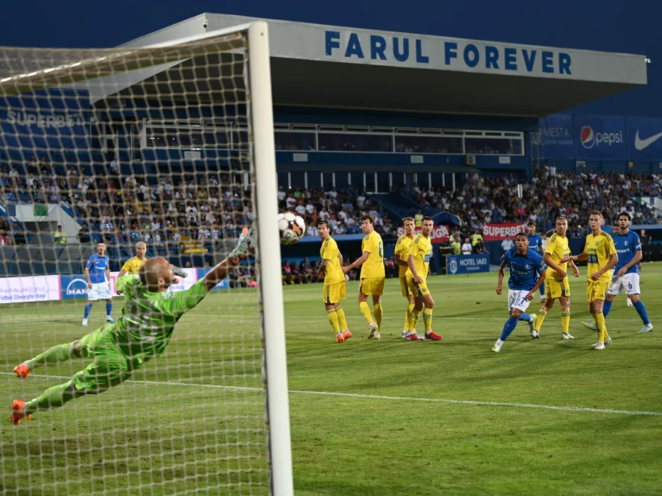Aapo Halme, Rivaldinho (Mosca Rivaldo Vitor Ferreira) si Tudor Cristian Baluta la o lovitura libera executata in meciul de fotbal dintre Farul Constanta si HJK Helsinki, contand pentru UEFA Europa Conference League, desfasurat pe Stadionul central al Academiei Gheorghe Hagi din Ovidiu, joi 24 august 2023. © FOTO:Razvan Pasarica/SPORT PICTURES