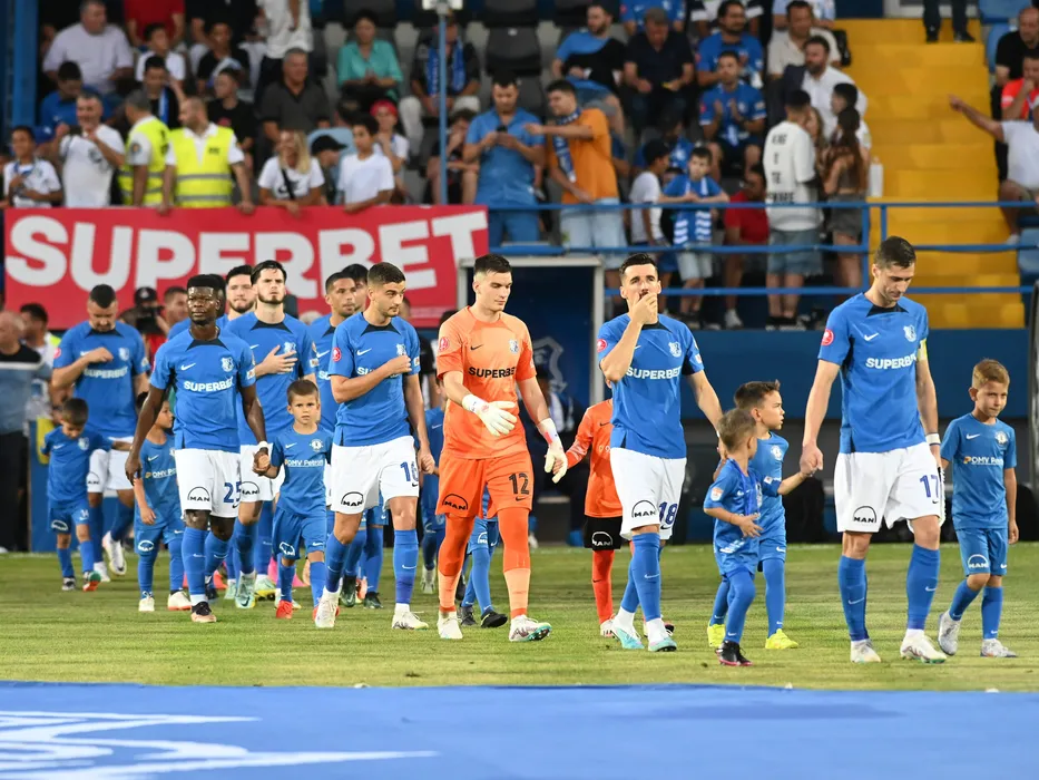 Fotbalistii constanteni la startul meciului de fotbal dintre Farul Constanta si HJK Helsinki, contand pentru UEFA Europa Conference League, desfasurat pe Stadionul central al Academiei Gheorghe Hagi din Ovidiu, joi 24 august 2023. © FOTO:Razvan Pasarica/SPORT PICTURES
