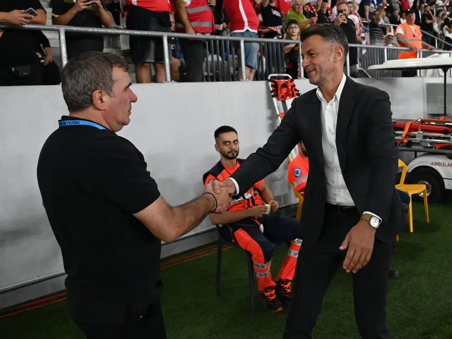 Cei doi antrenori Gheorghe Hagi si Ovidiu Nicusor Burca se saluta inaintea meciului de fotbal dintre Dinamo Bucuresti si Farul Constanta, din cadrul Superligii Superbet, desfasurat pe Stadionul National Arcul de Triumf din Bucuresti, vineri 22 septembrie 2023. © FOTO:Razvan Pasarica/SPORT PICTURES