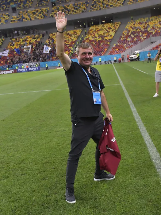 Gheorghe Hagi saluta galeria Rapidului la meciul de fotbal dintre Rapid Bucuresti si Farul Constanta, contand pentru Liga 1 Casa Pariurilor, desfasurat pe Arena Nationala din Bucuresti, vineri 30 iulie 2021. © FOTO:Razvan Pasarica/SPORT PICTURES