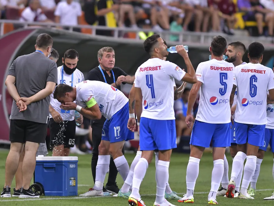 Fotbalistii constanteni alaturi de Gheorghe Hagi la o pauza de hidratare in meciul de fotbal dintre Rapid Bucuresti si Farul Constanta, contand pentru Liga 1 Casa Pariurilor, desfasurat pe Arena Nationala din Bucuresti, vineri 30 iulie 2021. © FOTO:Razvan Pasarica/SPORT PICTURES