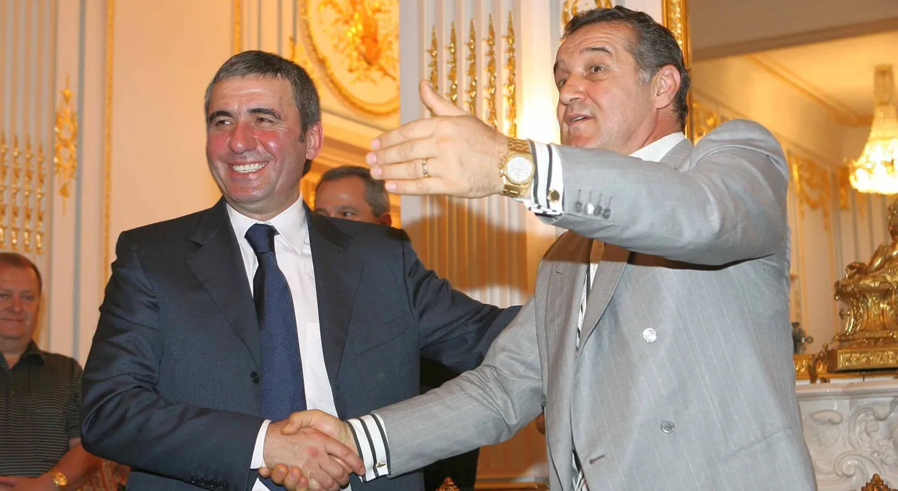 Tehnicianul Gheorghe Hagi (S) si finantatorul Gigi Becali (D) dau mana, la finalul unei conferinte de presa, in Bucuresti, luni, 25 iunie 2007. Gheorghe Hagi a fost prezentat oficial in functia de antrenor al echipei Steaua, finantatorul Gigi Becali anuntand ca fostul selectioner a semnat un contract pe trei sezoane. GEORGE FILIP / MEDIAFAX FOTO