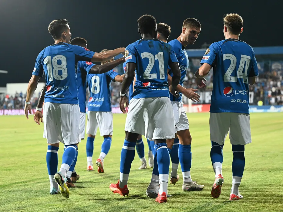 Bucurie a fotbalistilor craioveni dupa un gol marcat cu Andrei Viorel Artean si Dragos Ionut Nedelcu in meciul de fotbal dintre Farul Constanta si Universitatea Craiova, contand pentru Superliga Superbet, desfasurat pe Stadionul central al Academiei Gheorghe Hagi din Ovidiu, duminica 27 august 2023. © FOTO:Razvan Pasarica/SPORT PICTURES