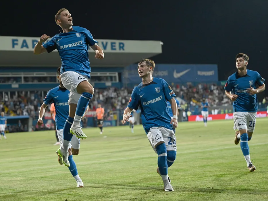 Louis Munteanu se bucura dupa un gol marcat alaturi de Constantin Grameni si Adrian Mazilu in meciul de fotbal dintre Farul Constanta si Universitatea Craiova, contand pentru Superliga Superbet, desfasurat pe Stadionul central al Academiei Gheorghe Hagi din Ovidiu, duminica 27 august 2023. © FOTO:Razvan Pasarica/SPORT PICTURES