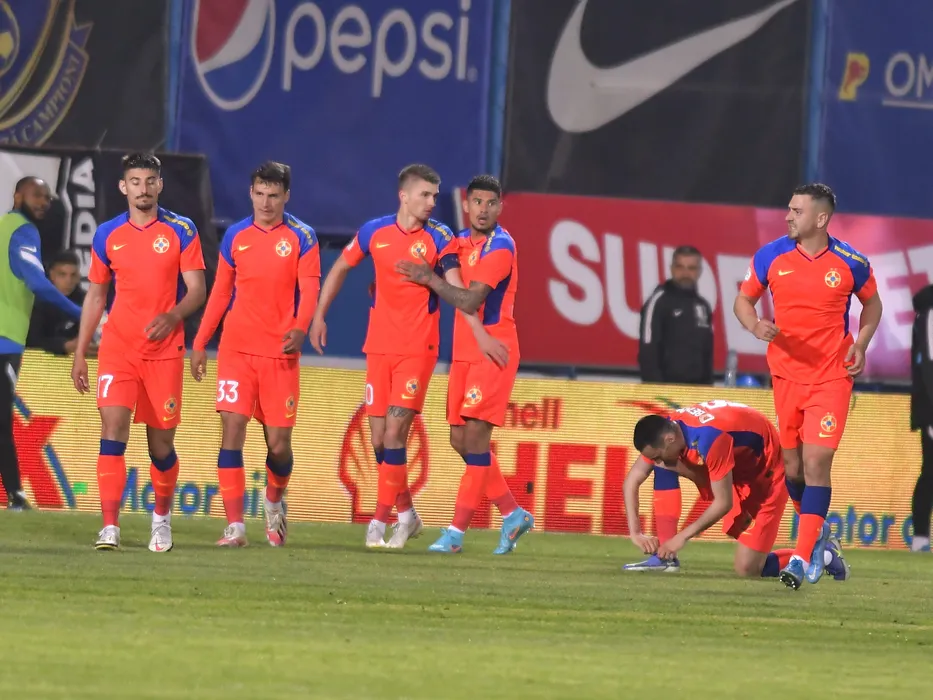 Bucurie a fotbalistilor stelisti dupa un gol marcat cu Iulian Lucian Cristea, Risto Radunovic, Florin Lucian Tanase, Octavian George Popescu si Andrei George Miron in meciul de fotbal dintre Farul Constanta si FCSB, contand pentru Play off-ul Ligii 1 Casa Pariurilor, desfasurat pe Stadionul central al Academiei Gheorghe Hagi din Ovidiu, luni 25 aprilie 2022. © FOTO:Razvan Pasarica/SPORT PICTURES