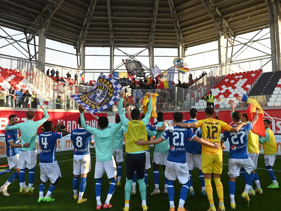 Fotbalistii constanteni fluturand steaguri tricolore canta alaturi de galerie dupa victoria din meciul de fotbal dintre Sepsi OSK Sfantu Gheorghe si Farul Constanta, contand pentru Superliga Superbet, desfasurat pe Sepsi Arena din Sfantu Gheorghe, duminica 9 octombrie 2022. © FOTO:Razvan Pasarica/SPORT PICTURES