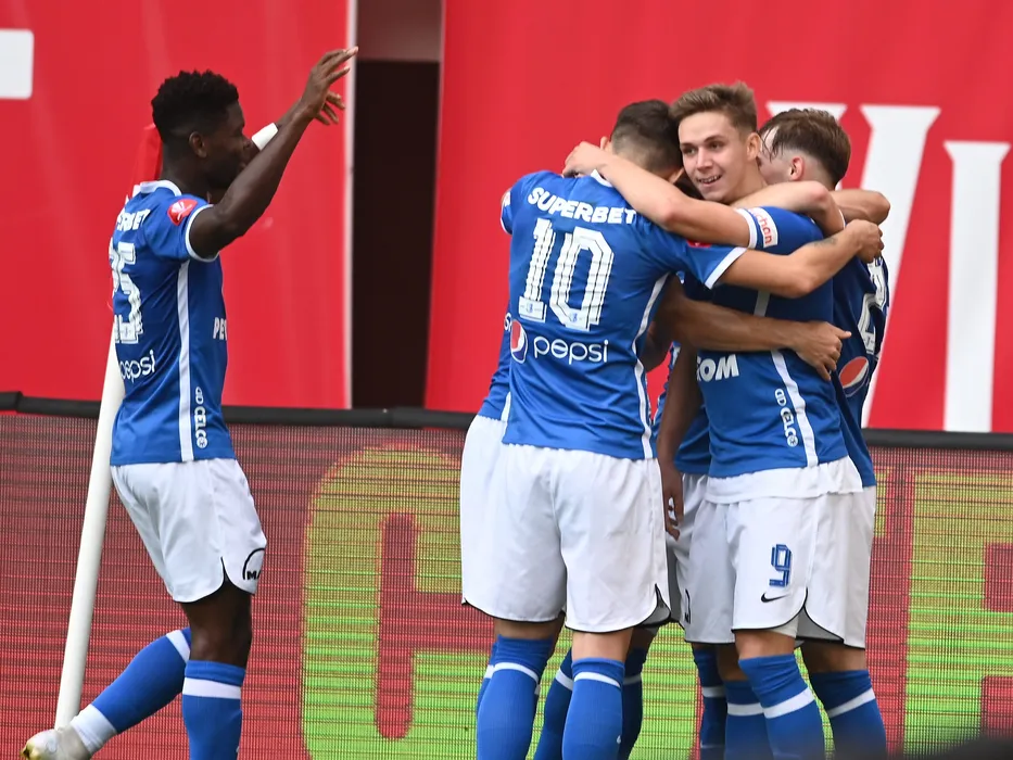 Bucurie a fotbalistilor constanteni dupa un gol marcat cu Enagnon David Kiki si Louis Munteanu in meciul de fotbal dintre Sepsi OSK Sfantu Gheorghe si Farul Constanta, contand pentru Superliga Superbet, desfasurat pe Sepsi Arena din Sfantu Gheorghe, duminica 9 octombrie 2022. © FOTO:Razvan Pasarica/SPORT PICTURES