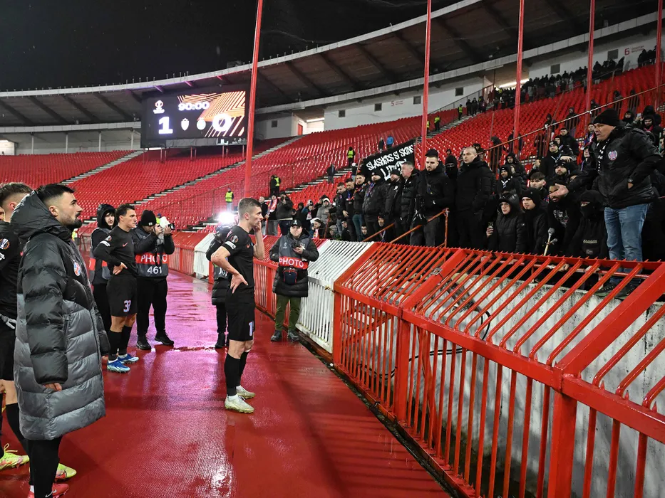 Fotbalistii ros-albastrii Valentin Cretu, Risto Radunovic si Florin Lucian Tănase discuta cu galeria ros albastra condusa de catre Gheorghe Mustata alaturi de tabela de marcaj dupa meciul de fotbal dintre Steaua Rosie Belgrad si FCSB, din cadrul UEFA Europa League, desfasurat pe Stadionul Rajko Mitić din Belgrad, joi 27 noiembrie 2025. © FOTO:Razvan Pasarica/SPORT PICTURES