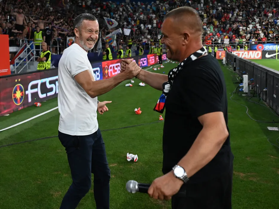 Mihai Stoica se bucura alaturi de Peluza Nord si Gheorghe Mustata dupa meciul de fotbal dintre FCSB si CFR Cluj, din cadrul Superligii Superbet, desfasurat pe Stadionul Steaua-Ghencea din Bucuresti, duminica 6 august 2023. © FOTO:Razvan Pasarica/SPORT PICTURES