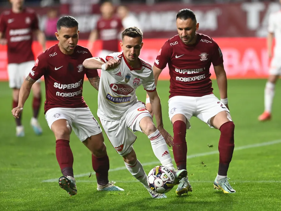 Morais Junior Iraneuton Sousa, Marius Stefanescu si Dragos Grigore in meciul de fotbal dintre Rapid Bucuresti si Sepsi OSK Sfantu Gheorghe, contand pentru Play off-ul Superligii Superbet, desfasurat pe Stadionul Rapid Giulesti din Bucuresti, vineri 12 mai 2023. © FOTO:Razvan Pasarica/SPORT PICTURES