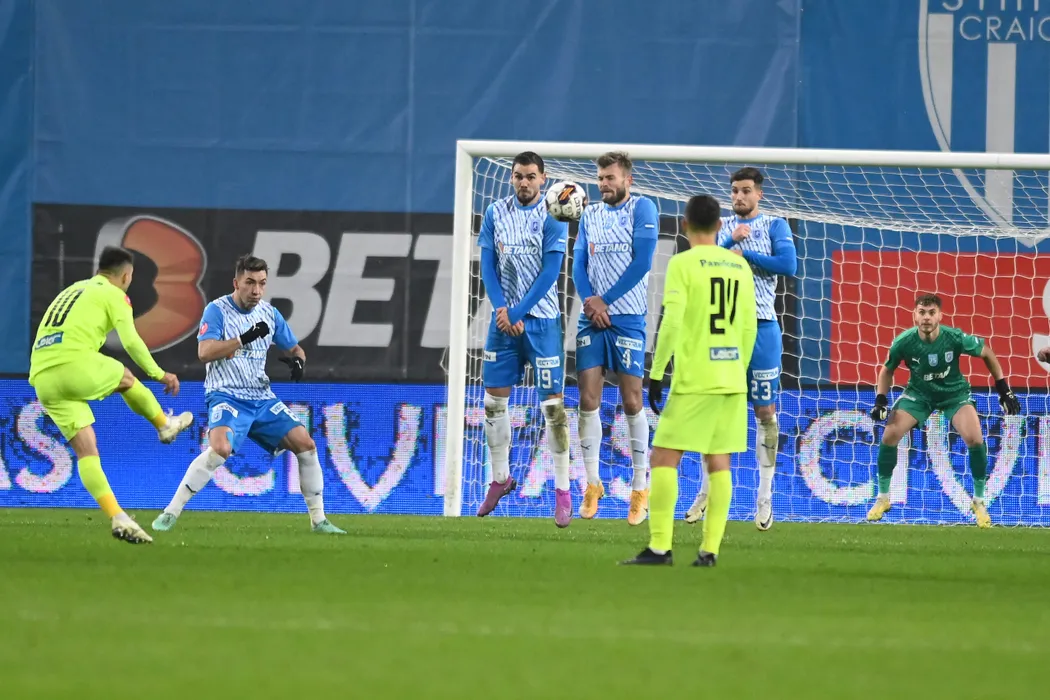 Alin Roman marcheaza un gol din lovitura libera in poarta lui Iulian Laurentiu Popescu peste zidul format din Alexandru Mateiu, Elvir Koljic, Alexandru Cretu si Cristian Mihai Capatina meciul de fotbal dintre Universitatea Craiova si Politehnica Iasi, contand pentru Superliga Superbet, desfasurat pe Stadionul Ion Oblemenco din Craiova, sambata 16 decembrie 2023. © FOTO:Razvan Pasarica/SPORT PICTURES