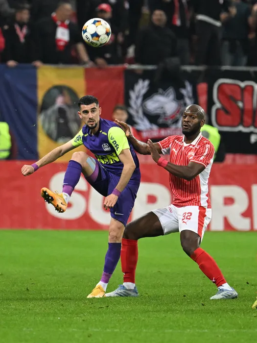 Meriton Korenica si Jordan Ikoko in meciul de fotbal dintre Dinamo Bucuresti si CFR Cluj, din cadrul Superligii Superbet, desfasurat pe Arena Nationala din Bucuresti, vineri 31 octombrie 2025. © FOTO:Razvan Pasarica/SPORT PICTURES