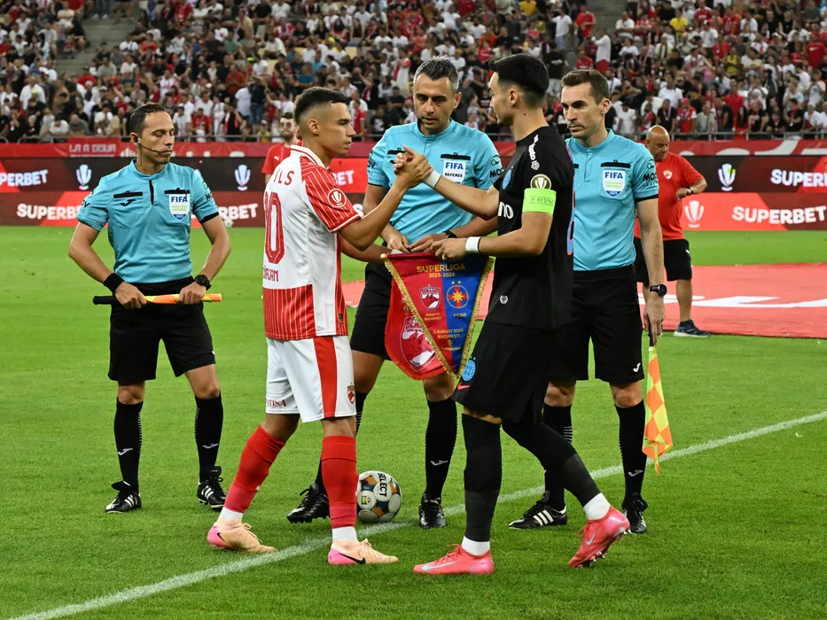 Brigada de arbitrii formata din Mihai Marius Marica, Horatiu Mircea Fesnic si Valentin Avram alaturi de capitanii Catalin Ionut Cirjan si Adrian Gheorghe Șut in meciul de fotbal dintre Dinamo Bucuresti si FCSB, contand pentru Superliga Superbet, desfasurat pe Arena Nationala din Bucuresti, sambata 2 august 2025. © FOTO:Razvan Pasarica/SPORT PICTURES
