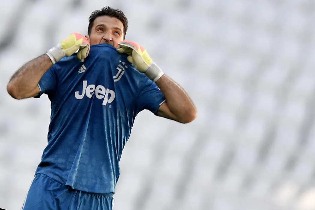 Juventus goalie Gianluigi Buffon reacts during the Serie A soccer match between Juventus and Torino, at the Allianz Stadium in Turin, Italy, Saturday, July 4, 2020. Juventus goalkeeper Gianluigi Buffon set an outright Serie A record on Saturday with his 648th appearance in Italys top flight. The Turin derby game against Torino moved the 42-year-old Buffon one ahead of AC Milan great Paolo Maldini, who set the record in 2009. (Fabio Ferrari/LaPresse via AP)