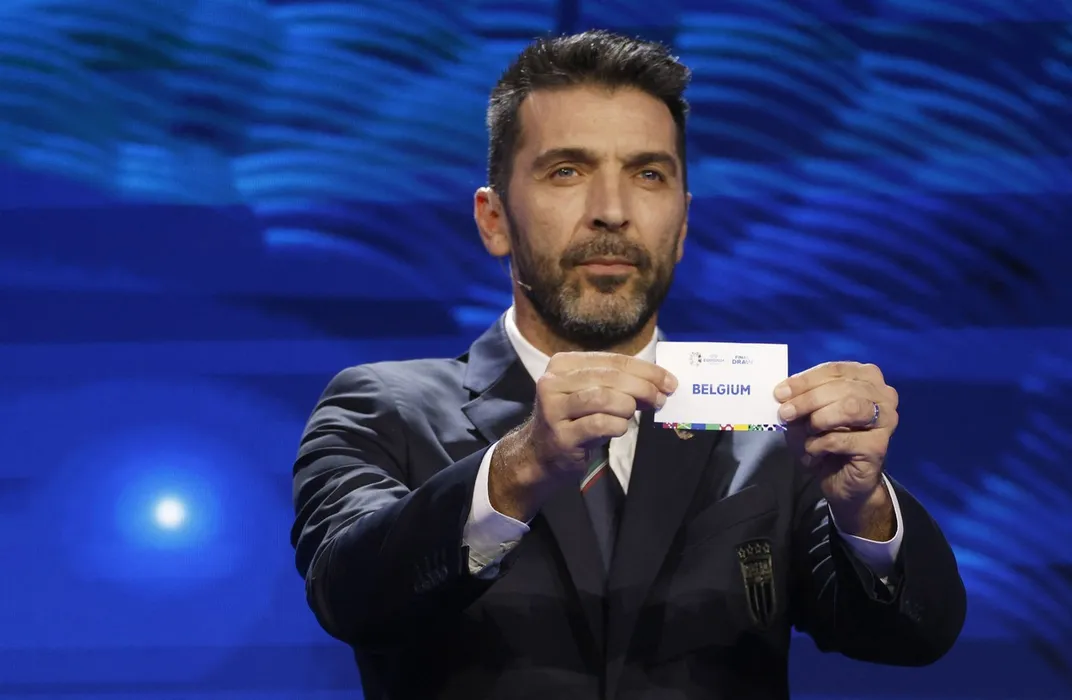 Italian former football player Gianluigi Buffon holds a paper reading "Belgium" during the final draw for the UEFA Euro 2024 European Championship football competition in Hamburg, northern Germany on December 2, 2023.,Image: 826186254, License: Rights-managed, Restrictions: , Model Release: no