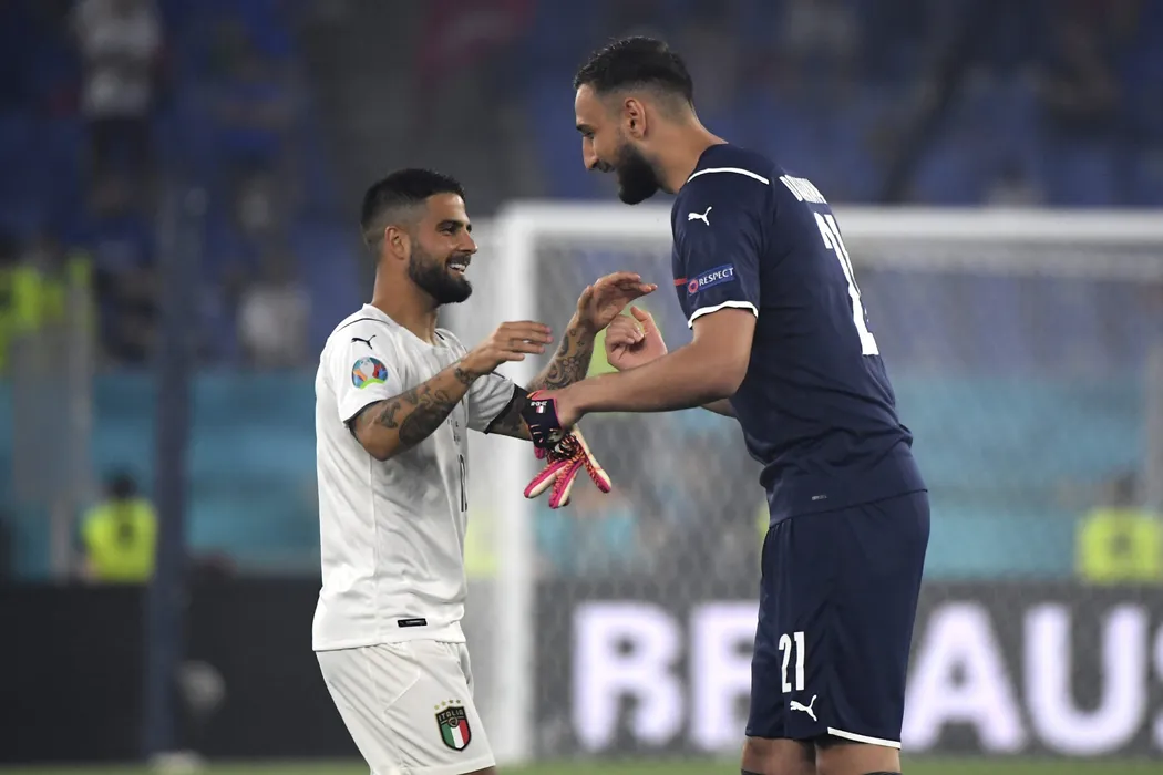 Italy's Lorenzo Insigne, left, cheers Italy's goalkeeper Gianluigi Donnarumma during the Euro 2020 soccer championship group A match between Italy and Turkey at the Olympic stadium in Rome, Friday, June 11, 2021. (Alberto Lingria/Pool Photo via AP)