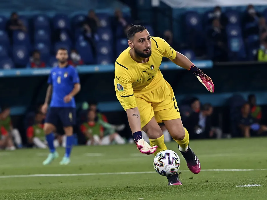 Italy's goalkeeper Gianluigi Donnarumma in action during the Euro 2020 soccer championship group A match between Italy and Switzerland at Olympic stadium in Rome, Wednesday, June 16, 2021. (Andreas Solaro/Pool Photo via AP)