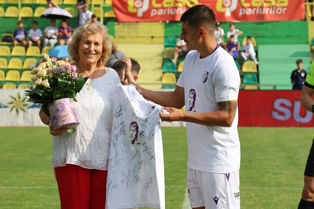 Doamna Gica Dobrin primește un buchet de flori și un tricou cu imaginea lui Nicolae Dobrin cu semnăturile tutuor otbaliștilor argeșeni de la Costinel Tofan la startul meciului de fotbal dintre ACS Campionii Fotbal Club Argeș și AFK Csikszereda Miercurea Ciuc, contând pentru Liga 2 Casa Pariurilor, desfășurat pe Stadionul Orășenesc din Mioveni, liuni 26 august 2024. © FOTO: Gabriela NEACȘU/SPORT PICTURES