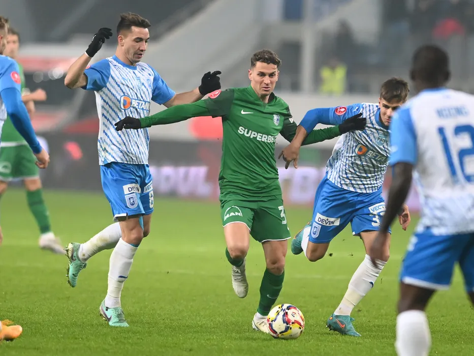 Alexandru Mateiu, Marco Borgnino si Marian Danciu in meciul de fotbal dintre Universitatea Craiova si Farul Constanta, contand pentru Cupa Romaniei Betano, desfasurat pe Stadionul Ion Oblemenco din Craiova, marti 5 decembrie 2023. © FOTO:Razvan Pasarica/SPORT PICTURES