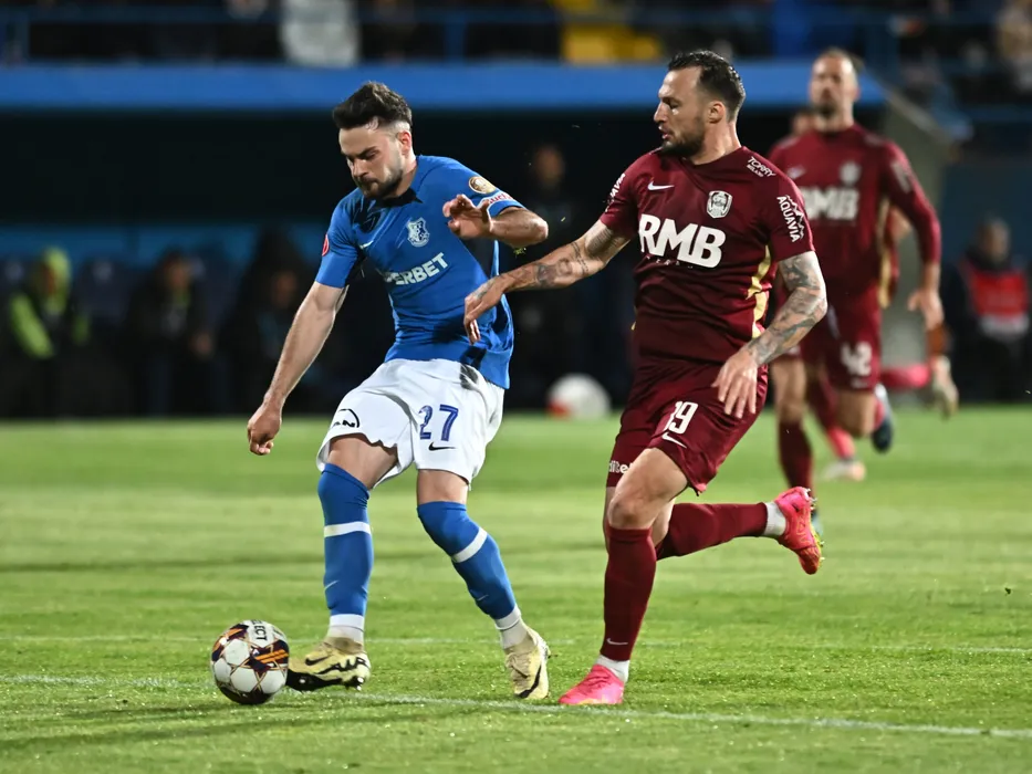 Ionuț Sebastian Cojocaru marchează un gol de lânga Vasile Mogos în meciul de fotbal dintre Farul Constanta si CFR Cluj, contând pentru Play off-ul Superligii Superbet, desfășurat pe Stadionul central al Academiei Gheorghe Hagi din Ovidiu, vineri 19 aprilie 2024. © FOTO: Razvan Pasarica/SPORT PICTURES